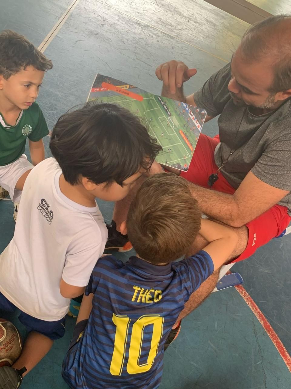 Durante a aula de Futebol do Período Complementar, os alunos leram sobre a história e curiosidades dessa modalidade, integrando esporte e literatura.