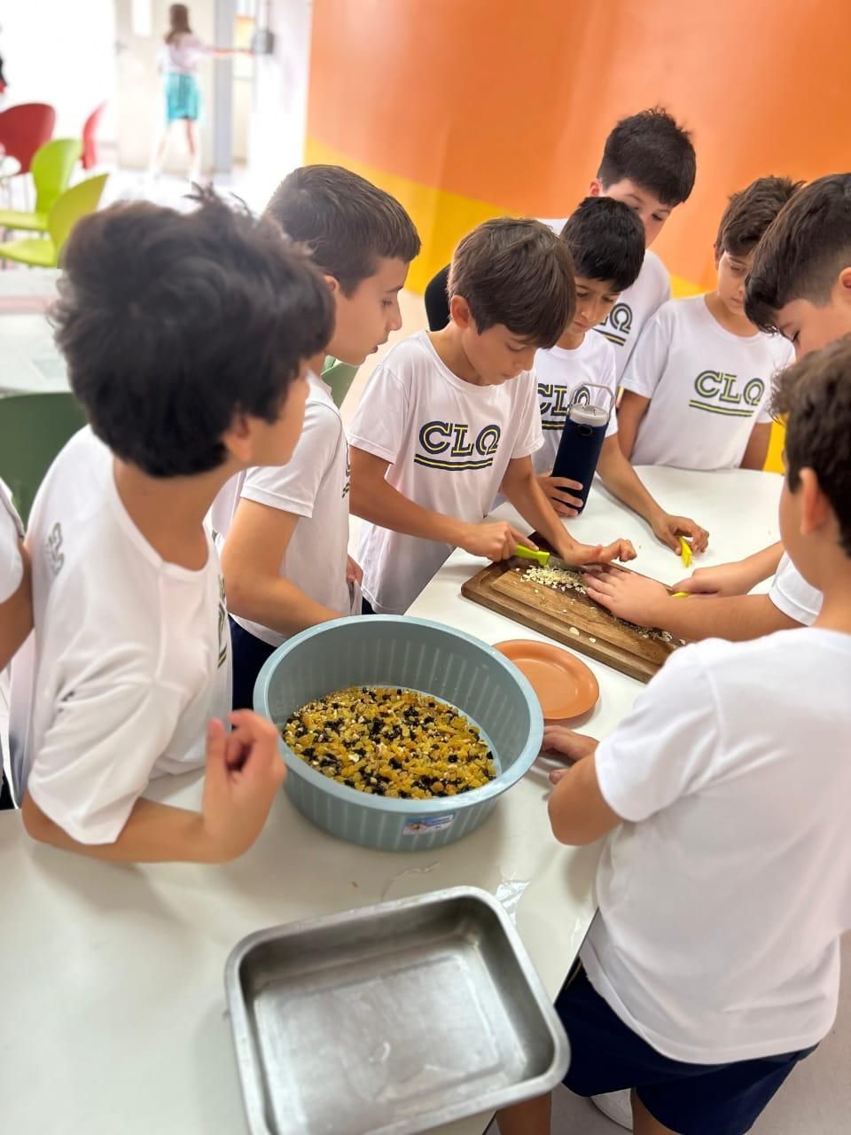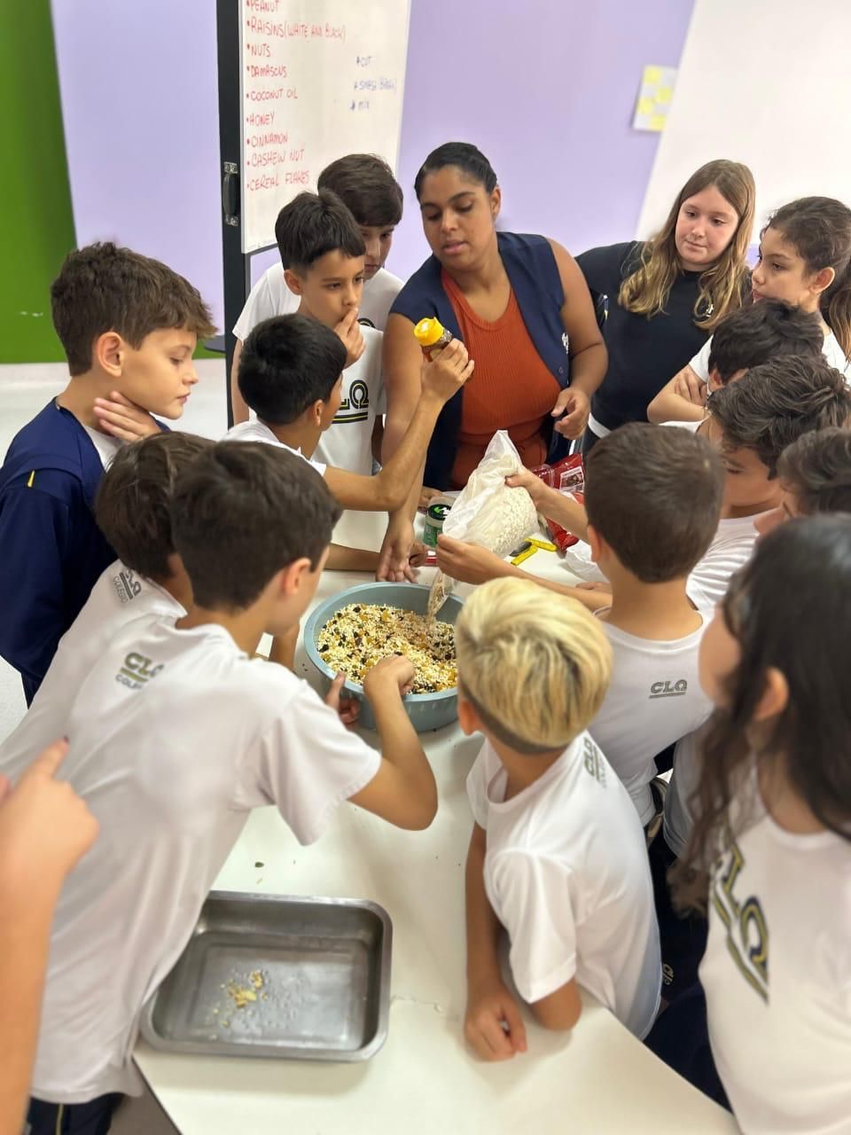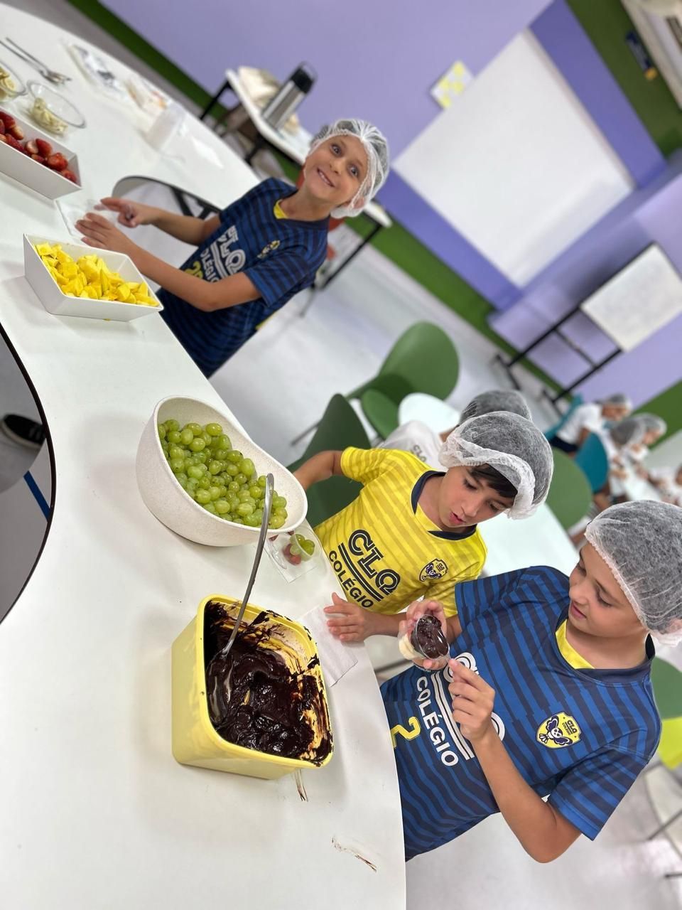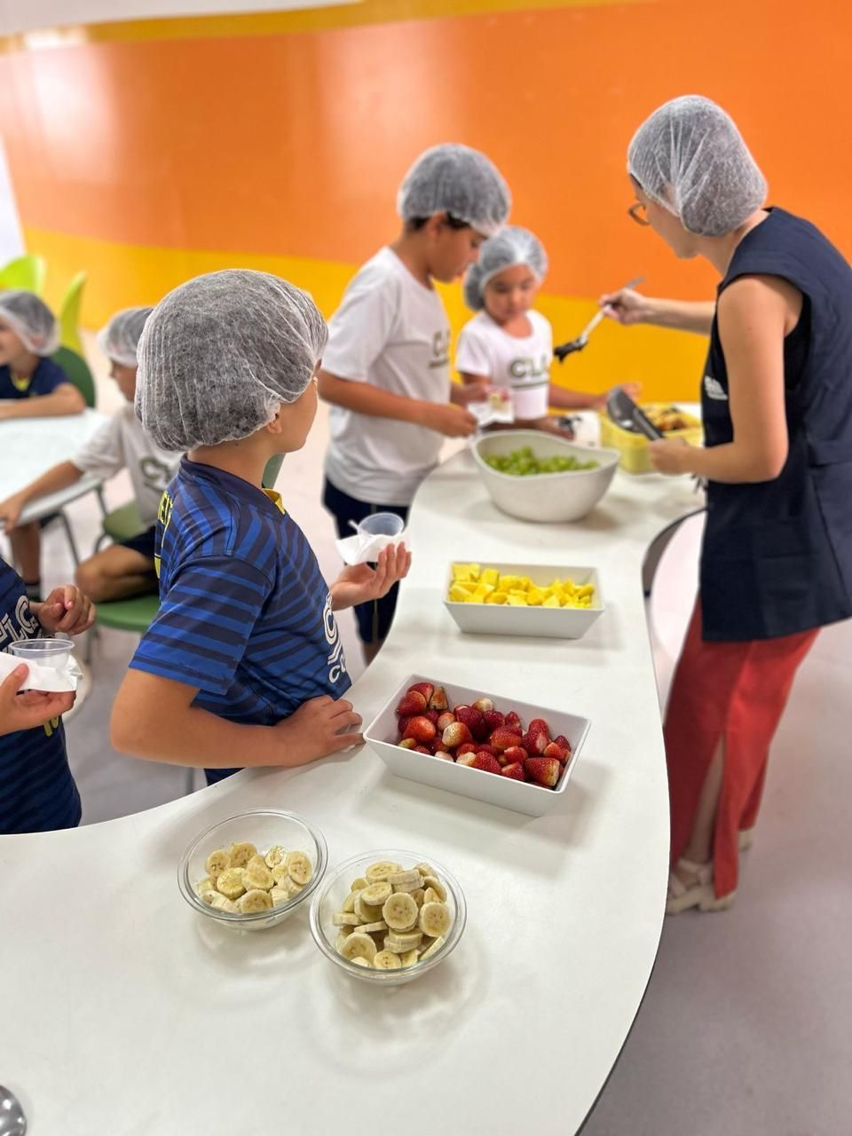 Turmas bilíngues participaram de aulas culinárias preparando salada de frutas e granola, ampliando vocabulário em inglês e trabalhando habilidades práticas e colaboração.