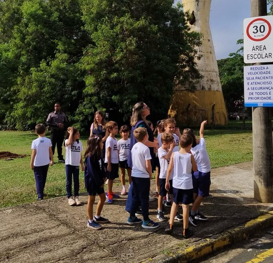 Como parte da unidade investigativa "Como nos organizamos", os alunos observaram placas, faixas e regras de trânsito em frente à escola, promovendo educação cidadã e respeito ao espaço público.