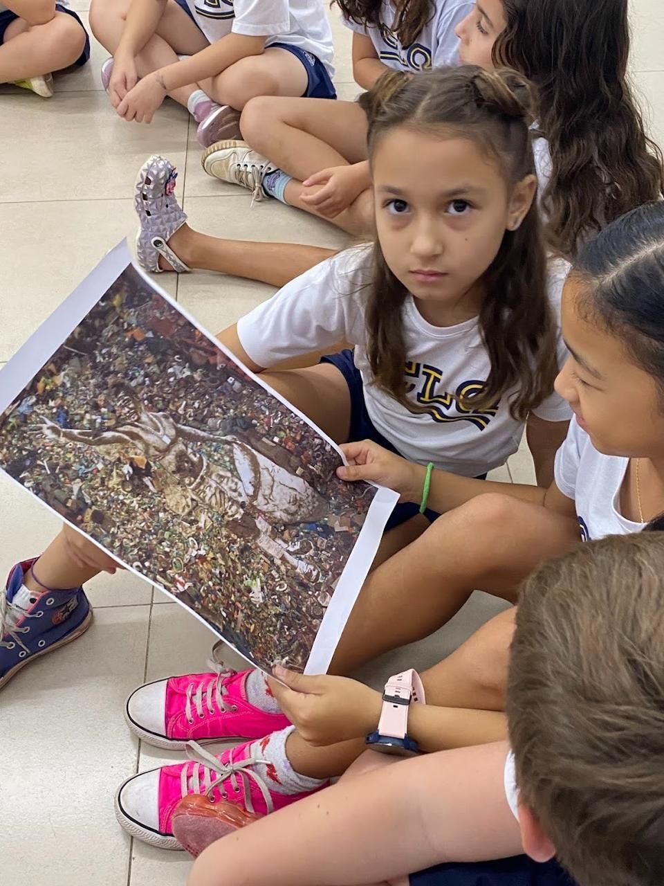 Inspirados em Vik Muniz, os alunos do 4º ano criaram obras com materiais recicláveis, enquanto os pequenos do G3 utilizaram tintas minerais feitas com terra.