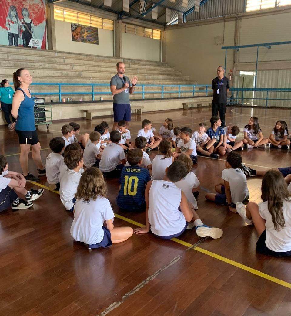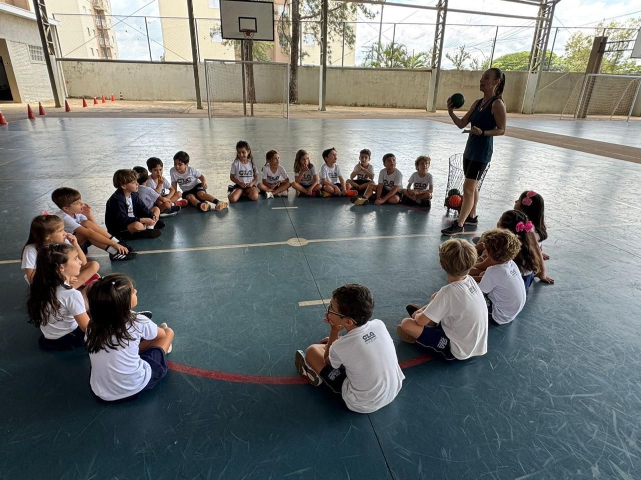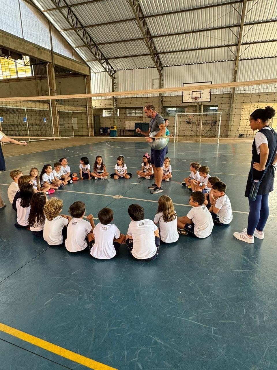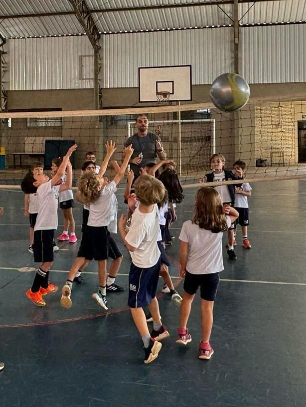 As crianças participaram de atividades recreativas no primeiro dia de aula, incluindo vôlei gigante e queimada russa, promovendo interação e diversão.